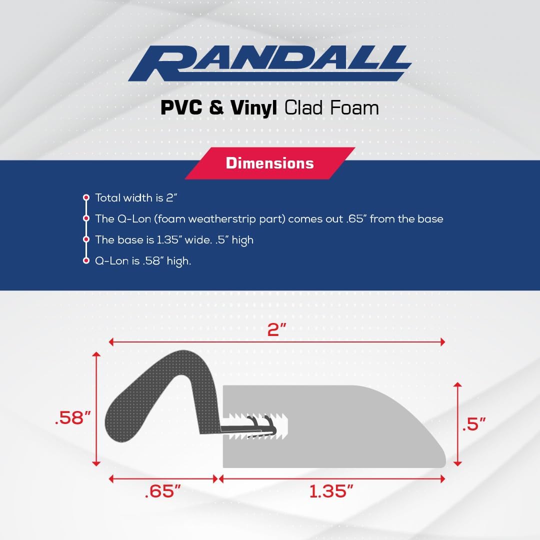 - Dimensions: 2" total width including foam weatherstrip, 1.35" width and .5" thickness for PVC base, foam "Q-LON" weatherstrip Extends .650" from PVC Base. Two 84" long pieces and One 36" long piece.